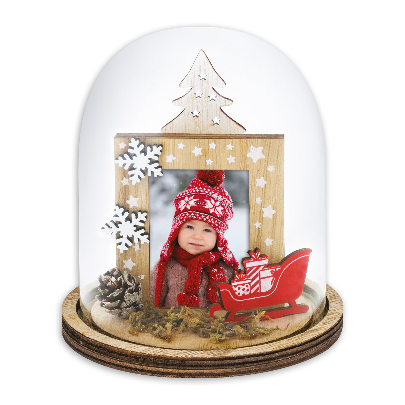 Palla di natale con foto, cupola in vetro con base in legno, con cornice in legno decorata a tema natalizio, personalizzabile con foto, da tavolo, idea regalo originale, addobbo o decorazione natalizia, regalo personalizzato.