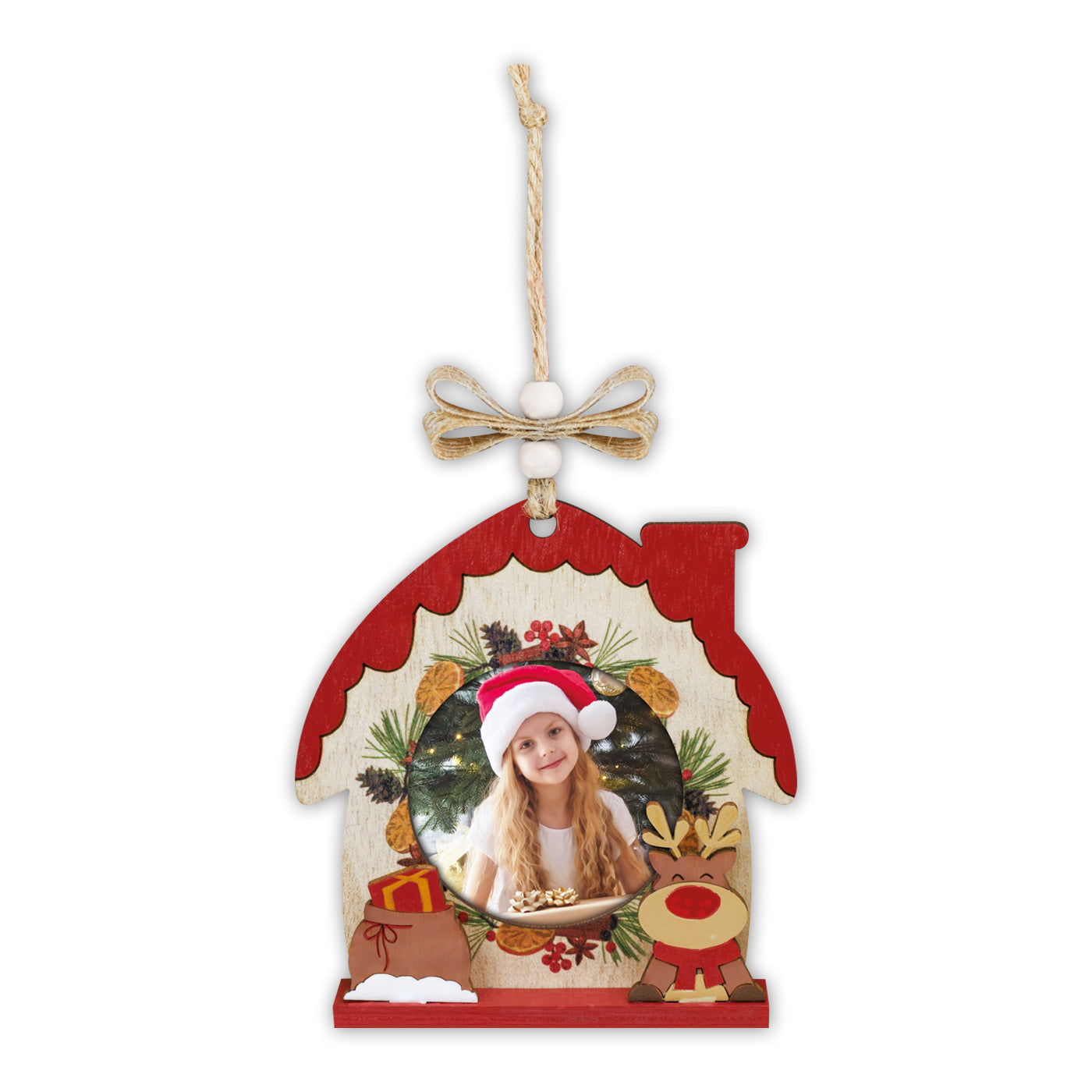 Decoro natalizio in legno colore rosso e legno naturale, a forma di casetta, con decori in rilievo, personalizzabile con una foto, da appendere, idea regalo originale, simpatico addobbo natalizio, reg