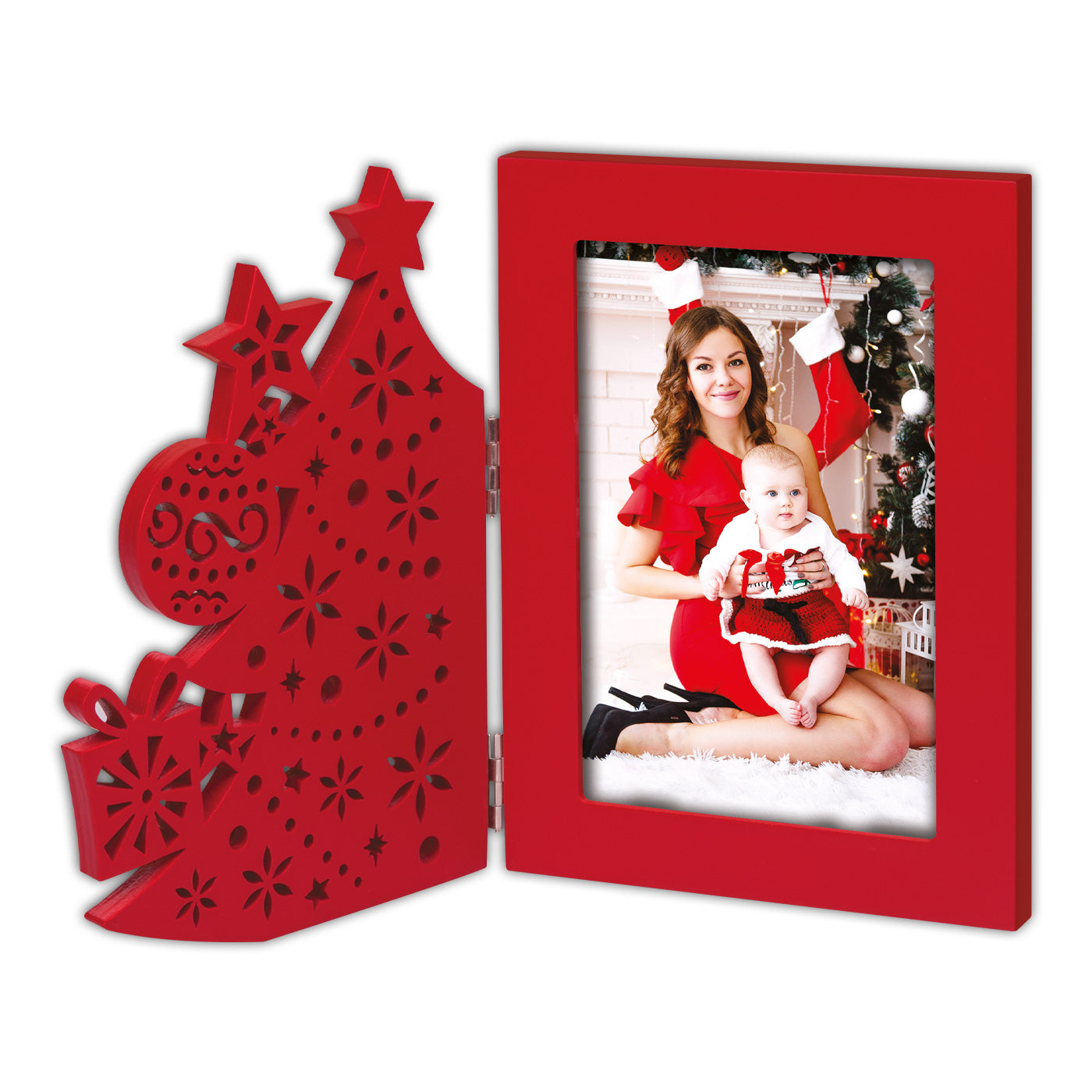 Cornice in legno, colore rosso, con decoro traforato a forma di albero di natale, a tema natalizio, da tavolo, idea regalo originale, decorazione natalizia, regalo personalizzato.