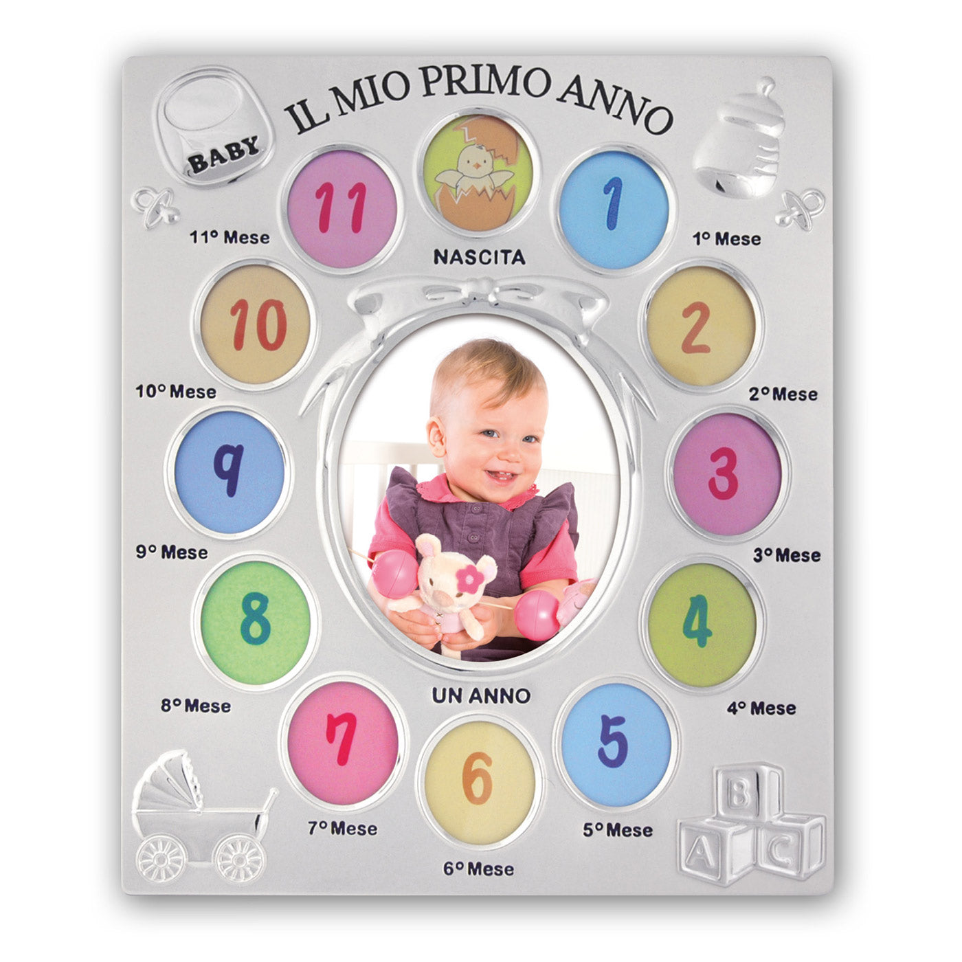 Cornice Nascita in metallo, colore argento, finitura opaca e lucida, decoro in 3D a tema neonato, con scritta IL MIO PRIMO ANNO, multifoto da tavolo, per 13 foto, con retro in velluto, ideale per celebrare la nascita, adatta ad un bambino/a, a tema baby.