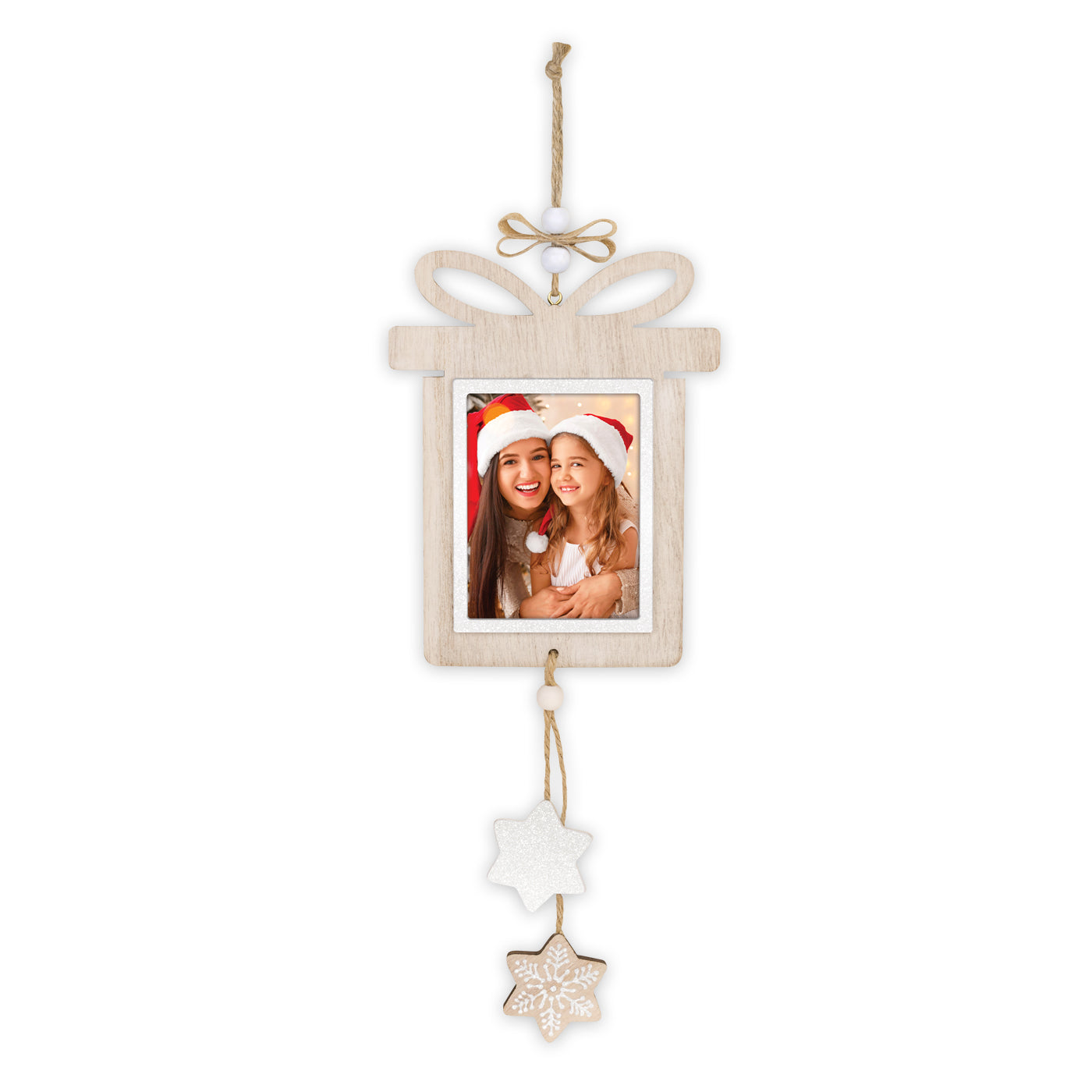 Decoro natalizio in legno con foto, a forma di pacco regalo, con decori in rilievo e glitterati, personalizzabile con una foto, da appendere, idea regalo originale, simpatico addobbo natalizio, regalo personalizzato.