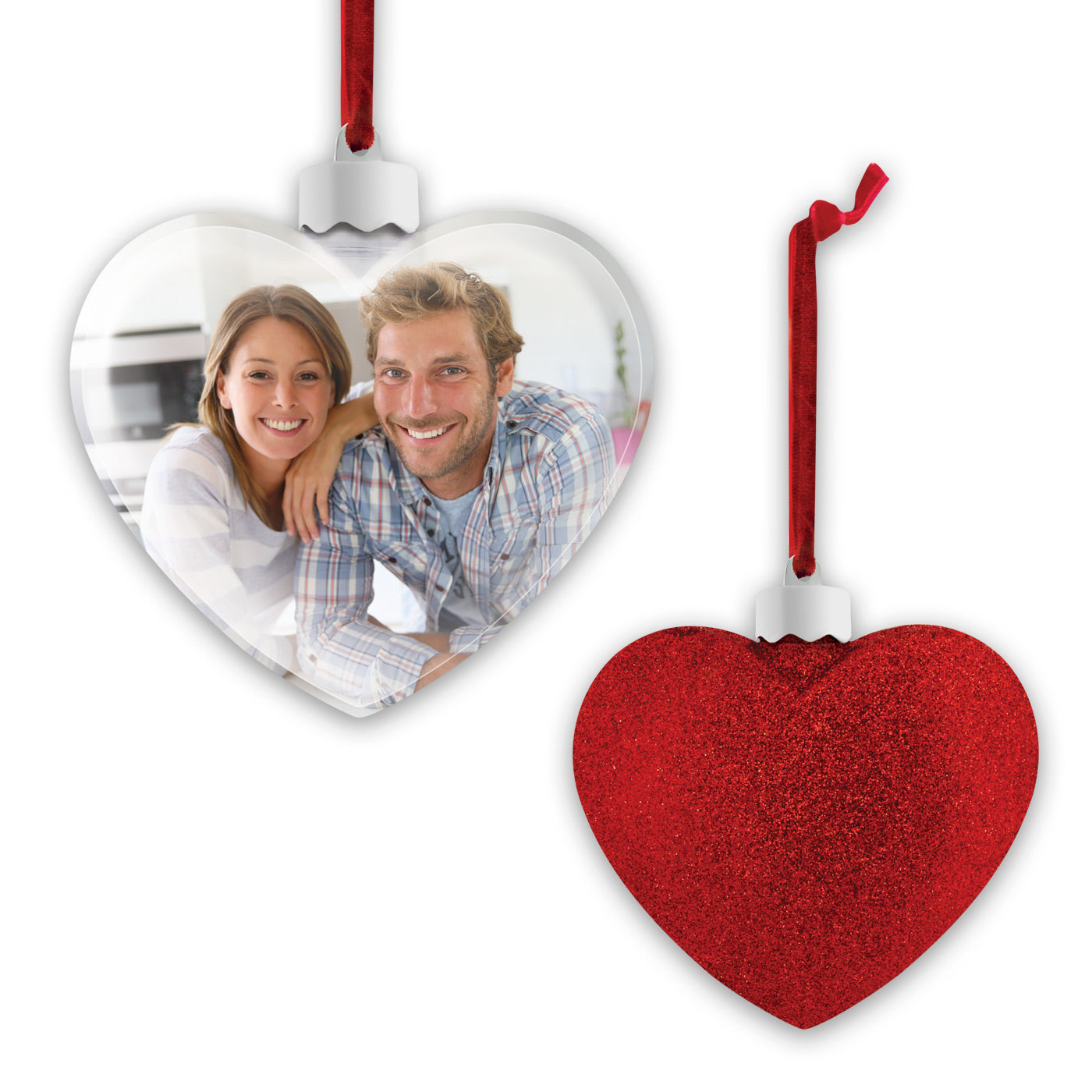 §Palla di Natale con foto a forma di cuore, in plastica effetto trasparente, personalizzabile con foto, da appendere, idea regalo originale, addobbo o decorazione natalizia, regalo personalizzato.