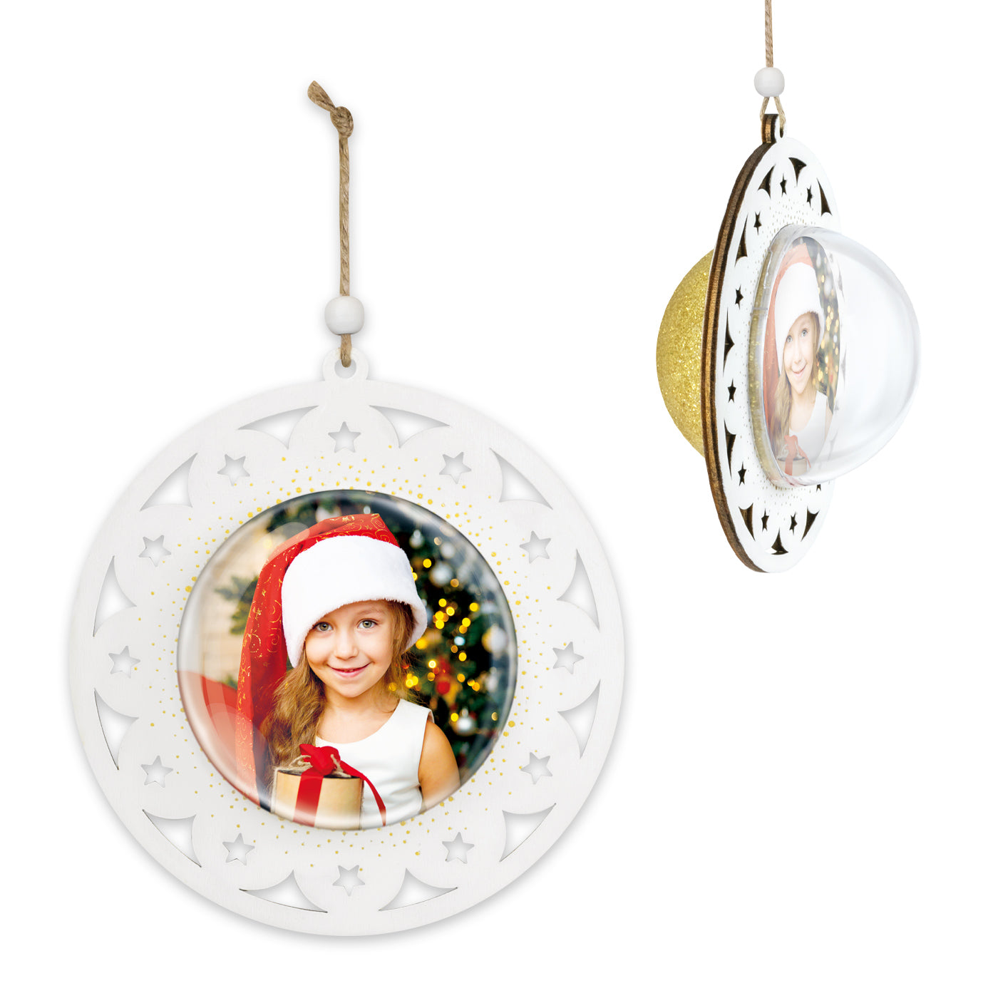 decoro natalizio traforato in legno, a forma di pallina di natale 3d, glitterato, nuovo sistema glitter stop per evitare che i brillantini si disperdano, personalizzabile con una foto, da appendere, idea regalo originale.