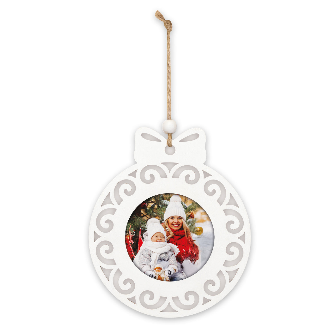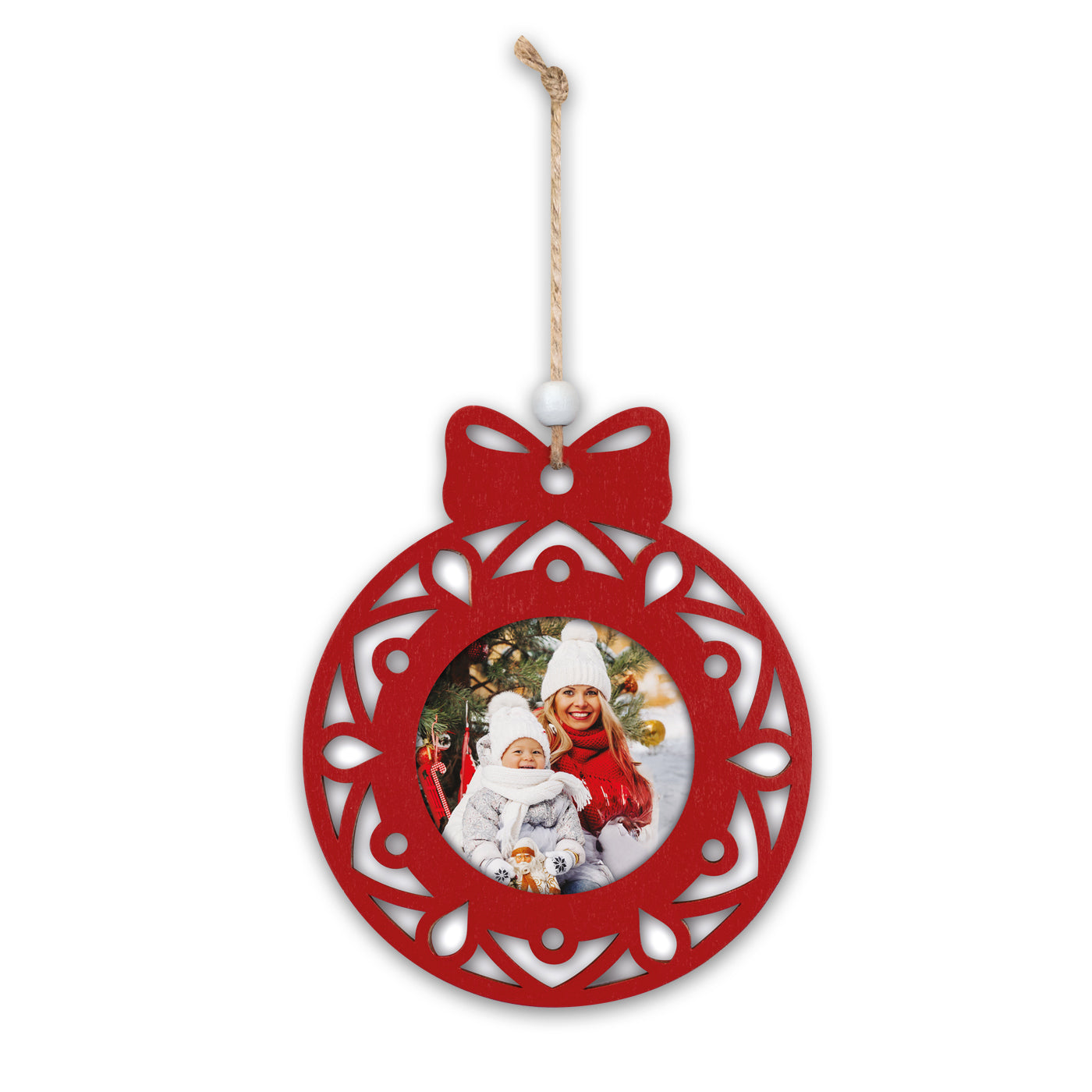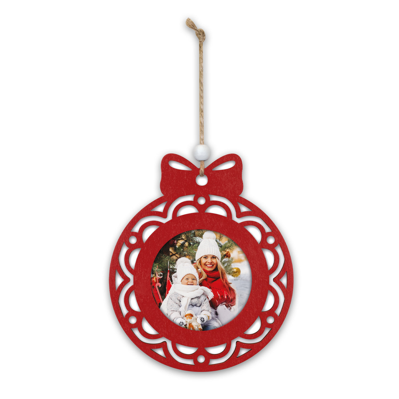 Decoro natalizio traforato in legno a forma di pallina di natale, con magnete, personalizzabile con una foto, da appendere, idea regalo originale.