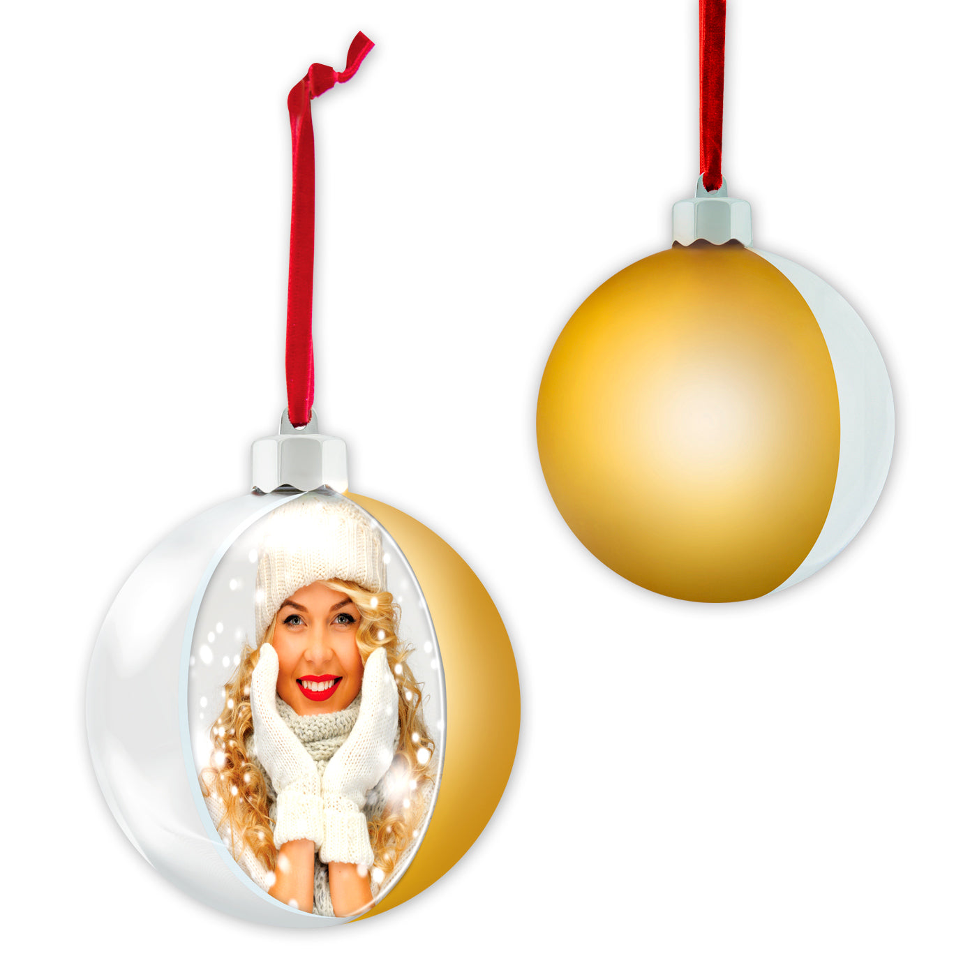 Christmas Gold Satin, palla di natale con foto, in plastica metà di colore oro metà trasparente, personalizzabile con foto, da appendere, idea regalo originale, addobbo o decorazione natalizia, regalo personalizzato.